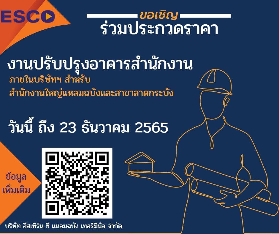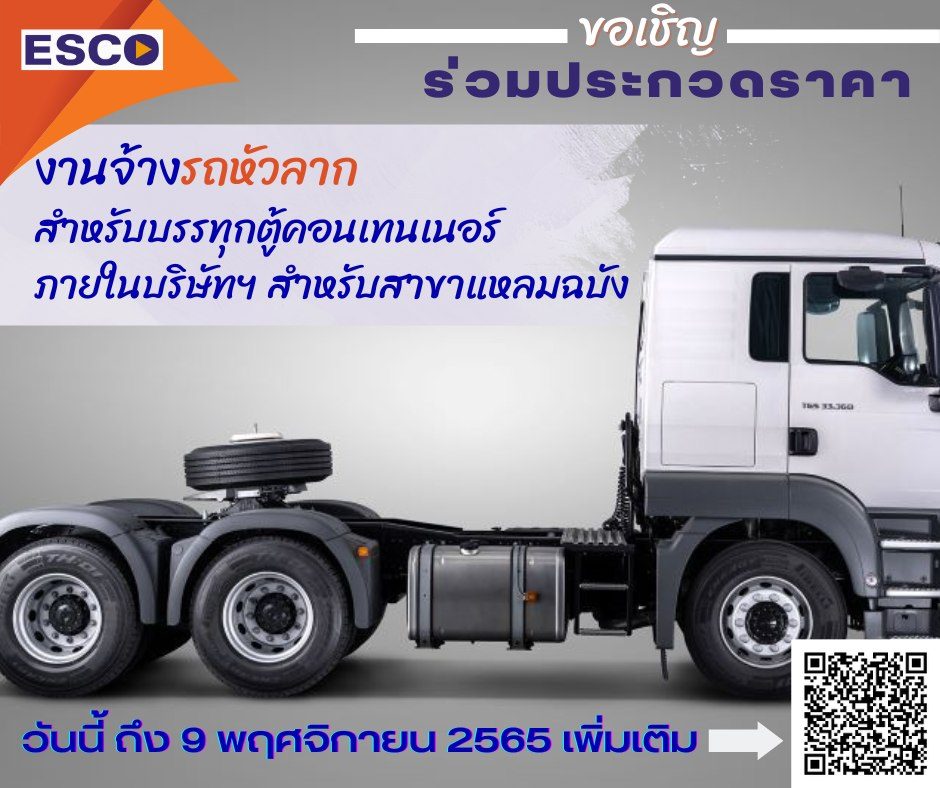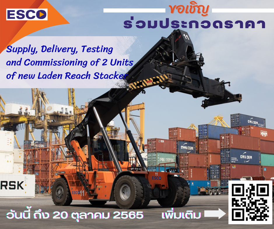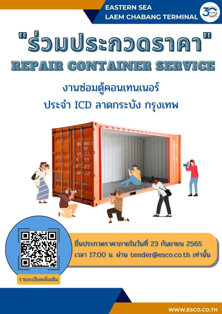 ขอเชิญผู้สนใจร่วมประกวดราคางานซ่อมตู้คอนเทนเนอร์ ประจำ ICD ลาดกระบัง ได้ตั้งแต่วันนี้ - จนถึงวันที่ 23 กันยายน 2565 เวลา 17.00 น. ส่งเอกสารประกอบผ่าน อีเมล์: tender@esco.co.th เท่านั้น