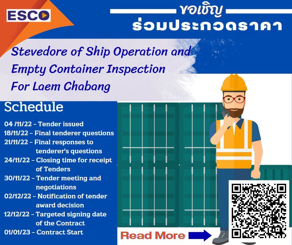 ขอเชิญผู้สนใจร่วมประกวดราคา งานจ้าง Stevedore of Ship Operation and Empty Container Inspection ภายในบริษัทฯ สำหรับสาขาแหลมฉบัง ได้ตั้งแต่วันนี้ - จนถึงวันที่ 18 พฤศจิกายน 2565 เวลา 17.00 น.